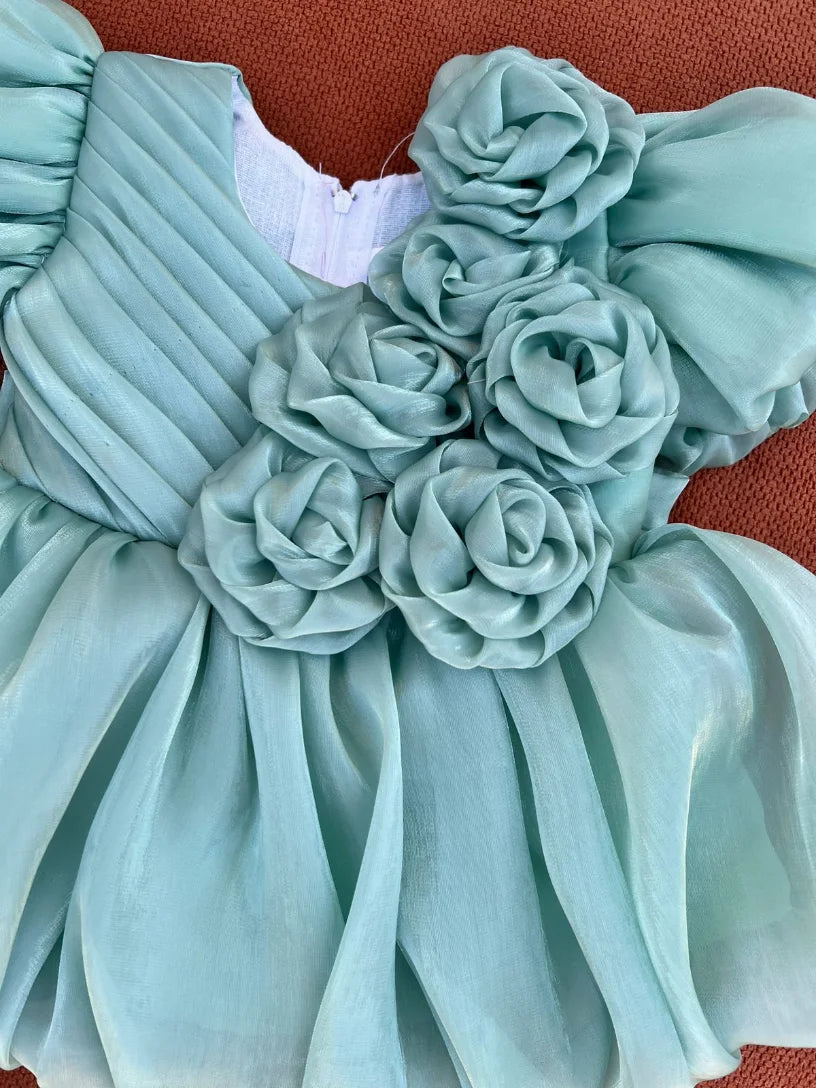 The dress features lovely floral detailing on the front with stylish puff sleeves, giving it a graceful and premium look. The soft and lightweight fabric ensures your baby stays comfortable while looking adorable.